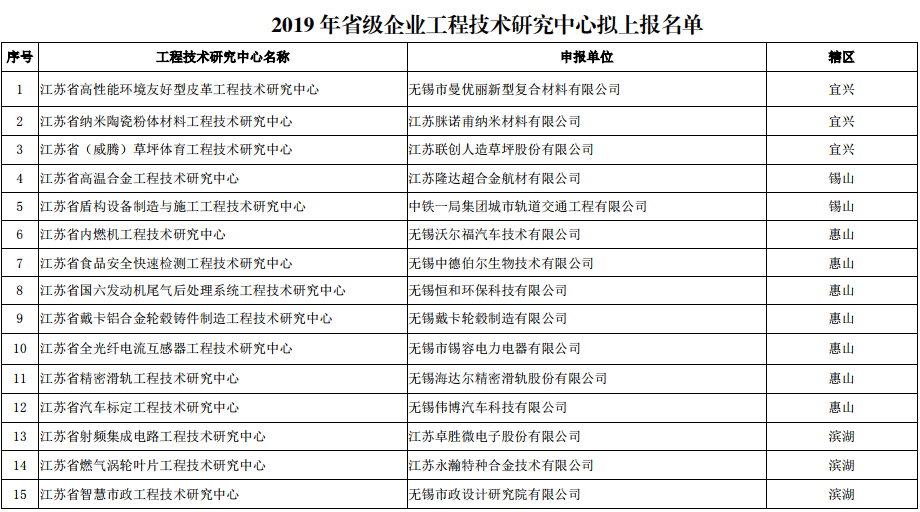 無錫市2019年省級企業(yè)工程技術(shù)研究中心擬上報結(jié)果的公示